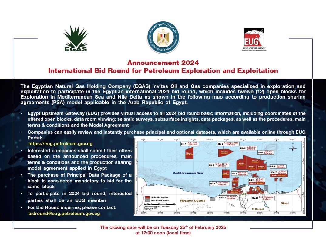 The Ministry of Petroleum and Mineral Resources announced that the Egyptian Natural Gas Holding Company (EGAS) has launched a new international 2024 bid round for the exploration and exploitation of natural gas and crude oil in 12 blocks in the Mediterranean and the Nile Delta. This includes 10 offshore blocks and two onshore blocks, through Egypt Upstream Gateway (EUG).