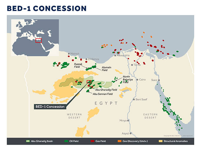 The target Concession covers an area of approximately 2,000 km2 (512,000 acres) in the Western Desert, nearly 20 times larger than the 26,000-acre BED-1 Concession. Of specific interest is the unconventional ARF oil formation that is present covering a large portion of the targeted Concession with indications of very good ARF reservoir properties, similar to the BED-1 Concession, which has estimated oil-initially-in-place of 532 MMbbl assigned to the ARF unconventional resource play. Completing this acquisition will expand TAG Oil’s footprint on this significant unconventional resource play in Egypt, as well as adding immediate conventional production and upside in proven reservoirs.