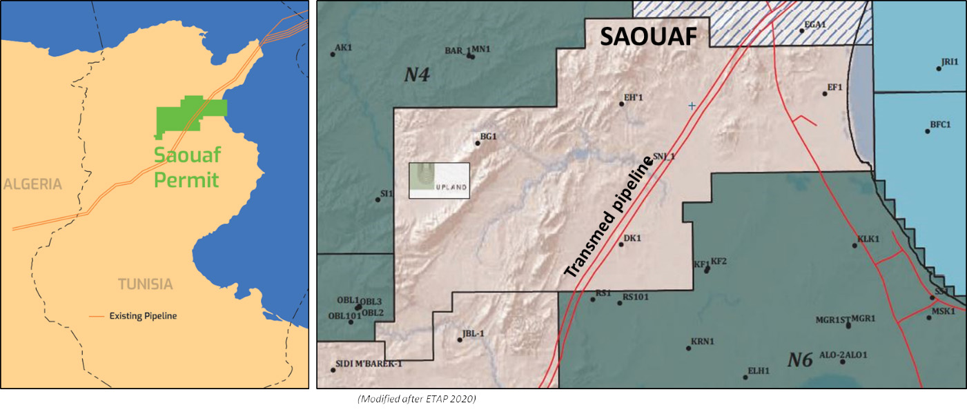 Upland’s subsidiary holds a 50% interest in the Saouaf Prospecting Permit in the Saouaf area of Tunisia (‘Permit’) in a Joint Venture with the Tunisian state oil company, Entreprise Tunisienne d’Activités Pétrolières (ETAP).